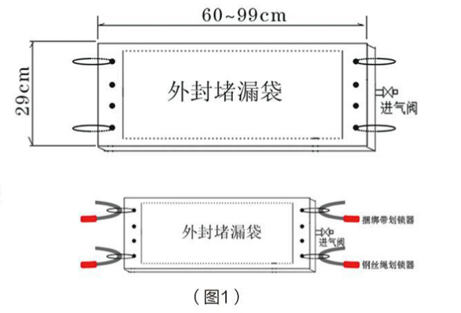 - 劃鎖器捆綁帶:將規(guī)格為寬50mm,厚2 - 6mm,長為10米高強(qiáng)度滌綸、丙綸、錦綸捆綁帶安裝上五金件劃鎖器成為捆綁充氣橡膠袋的捆綁帶,起名為“劃鎖器捆綁帶”,類同于男人扎的褲腰帶,用劃鎖器捆綁帶穿過充氣外封式堵漏袋(用于捆綁擠壓至泄漏孔上),在外封式堵漏袋與泄漏點(diǎn)之間安裝相應(yīng)規(guī)格的密封板,用于泄漏點(diǎn)的堵漏。